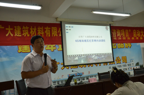 2015年7月14日,日照廣大建筑材料有限公司“6S規(guī)范化管理咨詢項目”啟動大會在研發(fā)中心大會議室隆重召開,公司董事長程永聚、副總經(jīng)理劉偉、許繡梅以及公司全體管理人員和各部門業(yè)務骨干近60人列席參會。項目啟動大會由辦公室主任王麗萍主持,明洋公司咨詢總監(jiān)王潤老師對廣大建材目前在企業(yè)管理方面尤其是生產(chǎn)管理方面存在的問題進行簡單介紹,同時對此項目的咨詢內(nèi)容、推進步驟、咨詢目標、項目推進計劃等做了詳細講解。